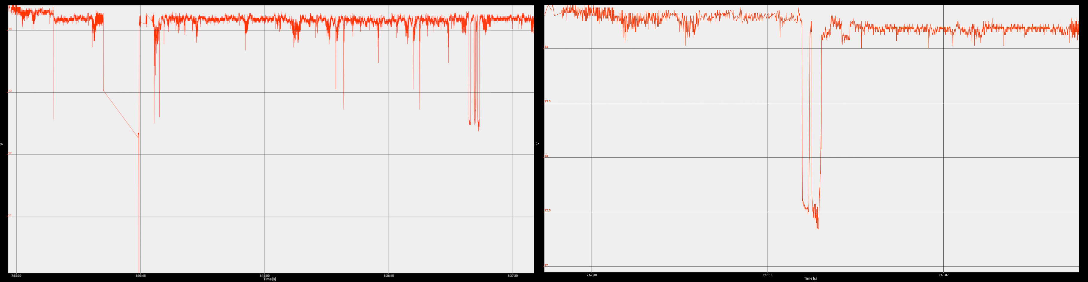 Voltage charts from the generator before and after the tensioner replacement show dips below 13V due to engine stops.