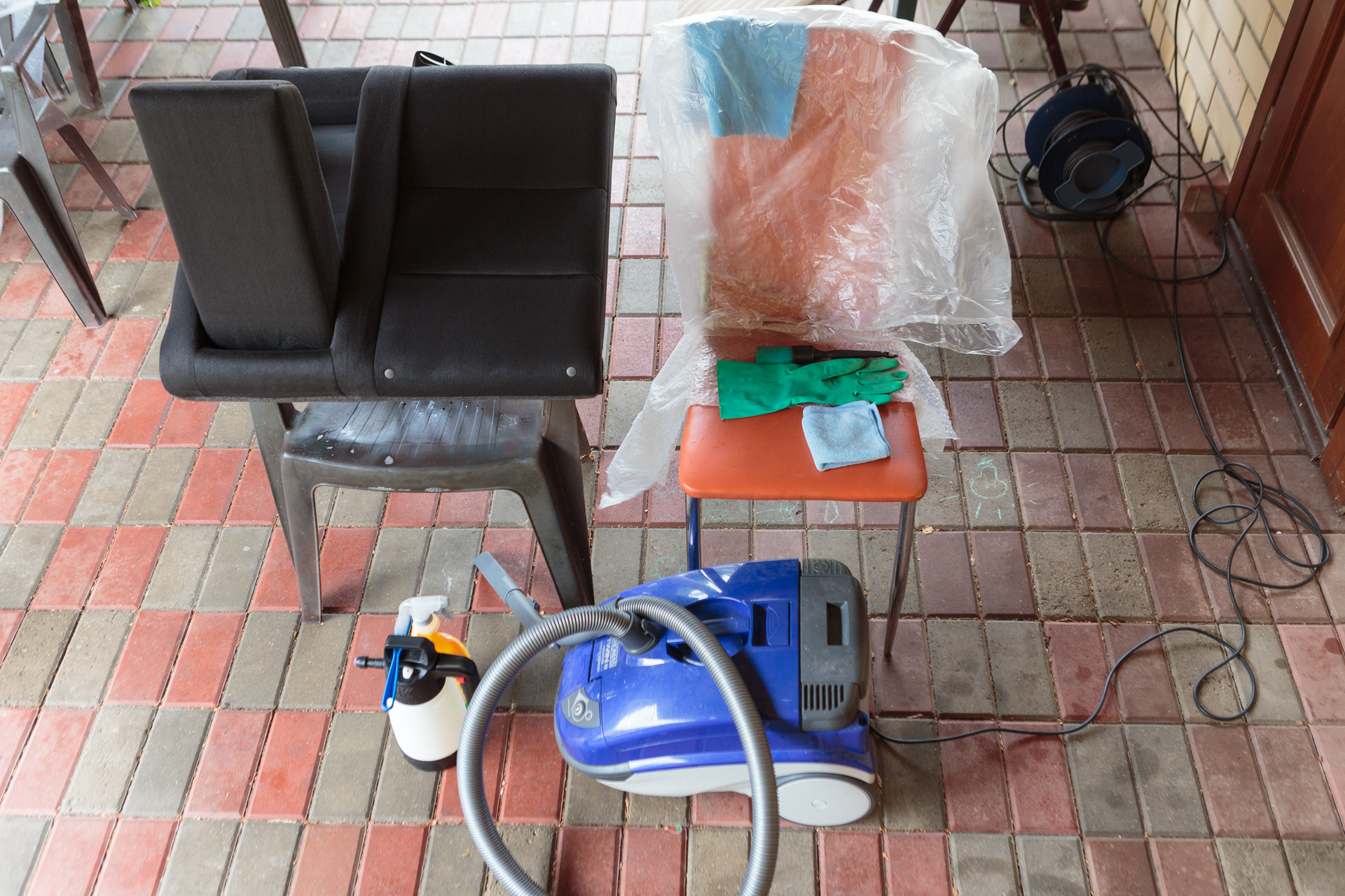• Start with a dry vacuum cleaning at minimal power (450 W) to reduce dust and avoid damaging the dry fabric